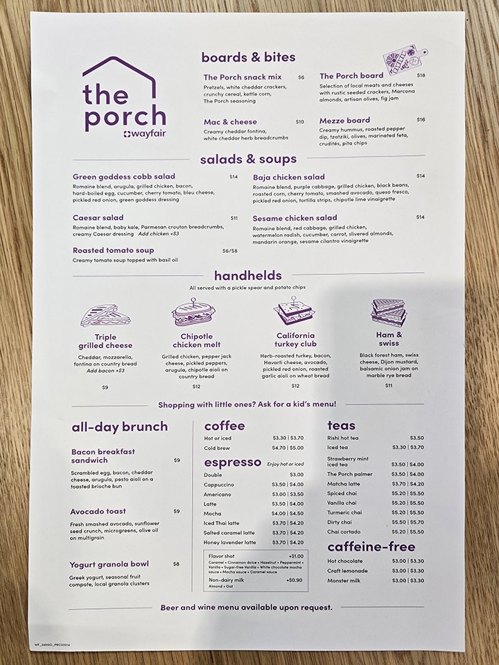 Welcome to The Porch Wilmette, a casual yet inviting American eatery located at the Wayfair store in Wilmette, IL. This delightful café offers a varied menu perfect for a leisurely break from shopping. Patrons can enjoy a selection of handhelds, such as the warm and melty California turkey club and the chipotle chicken melt, both made with in-house baked bread that truly elevates each sandwich.